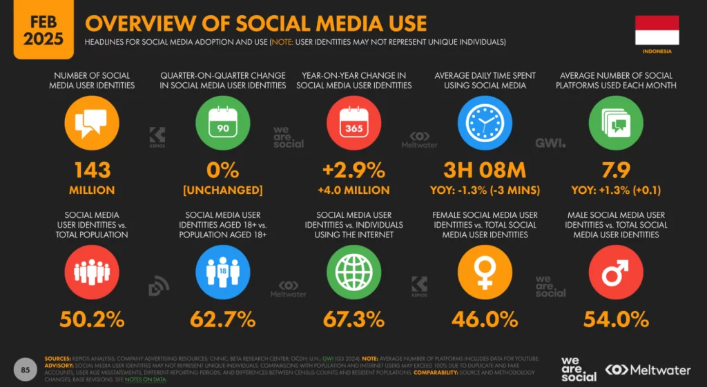 Jawabannya gede banget! Pengguna sosial media di Indonesia 2025 sudah mencapai 143 juta per bulan. Artinya lebih dari 50% penduduk Indonesia menggunakan sosial media dalam kehidupan sehari-hari.